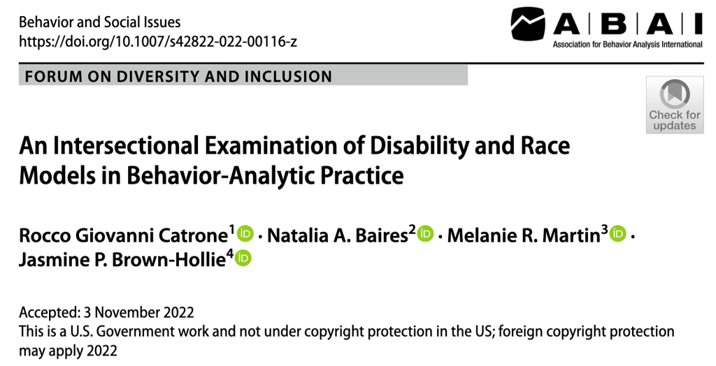 About the Research: Based on "An Intersectional Examination of Disability and Race Models in Behavior-Analytic Practice" by Rocco Giovanni Catrone, Natalia A. Baires, Melanie R. Martin, and Jasmine P. Brown-Hollie, published in Behavior and Social Issues (2022).